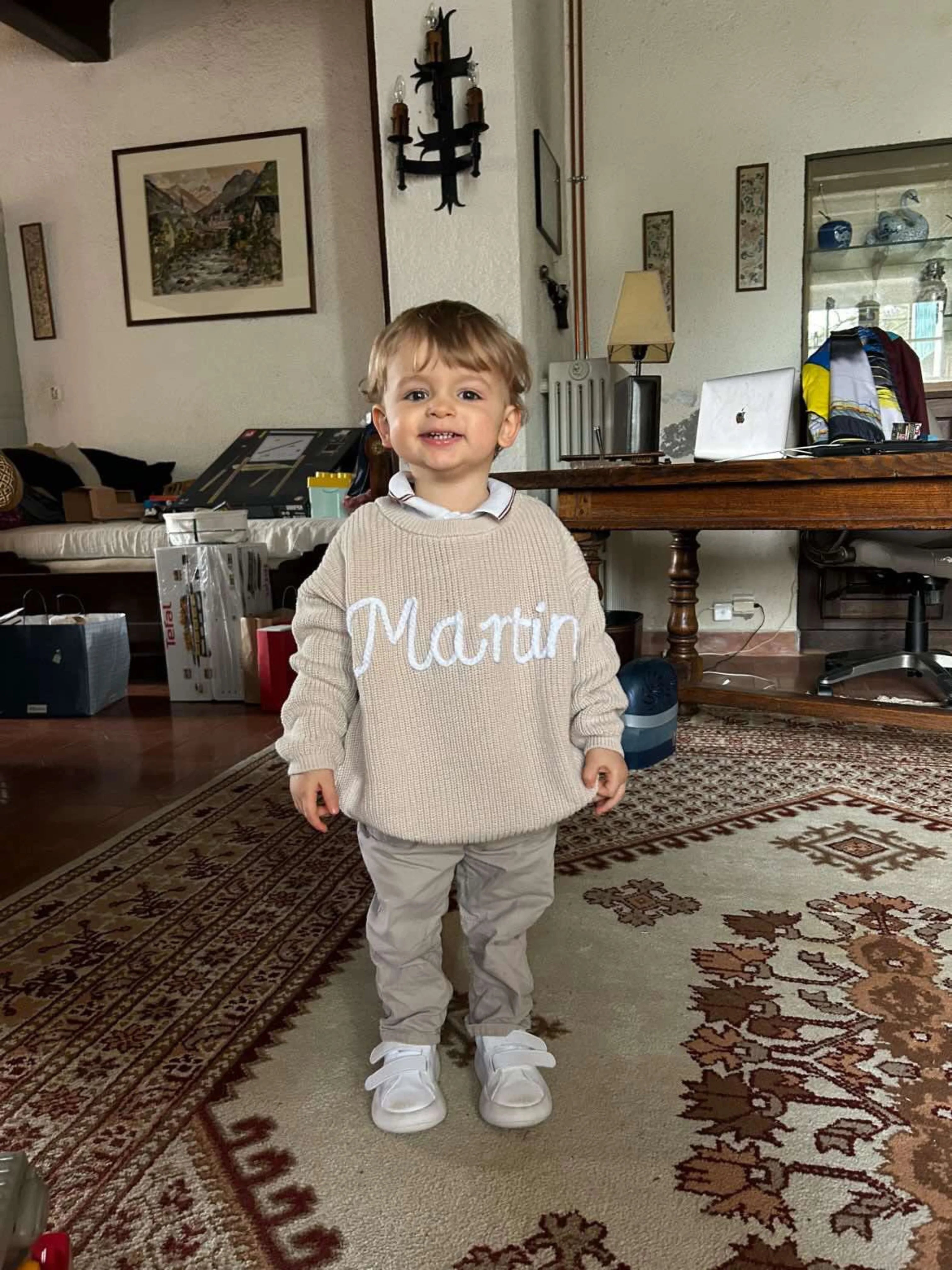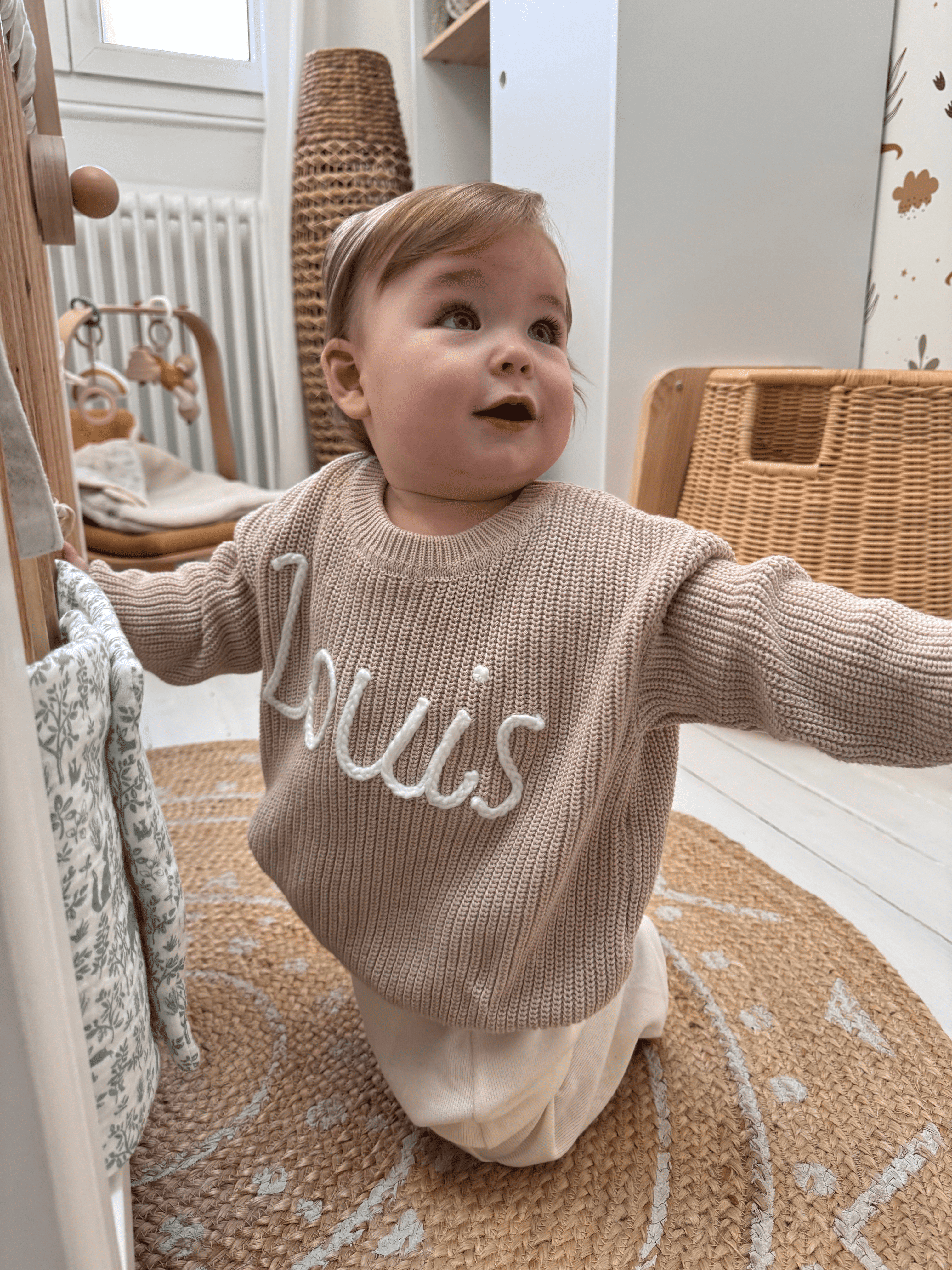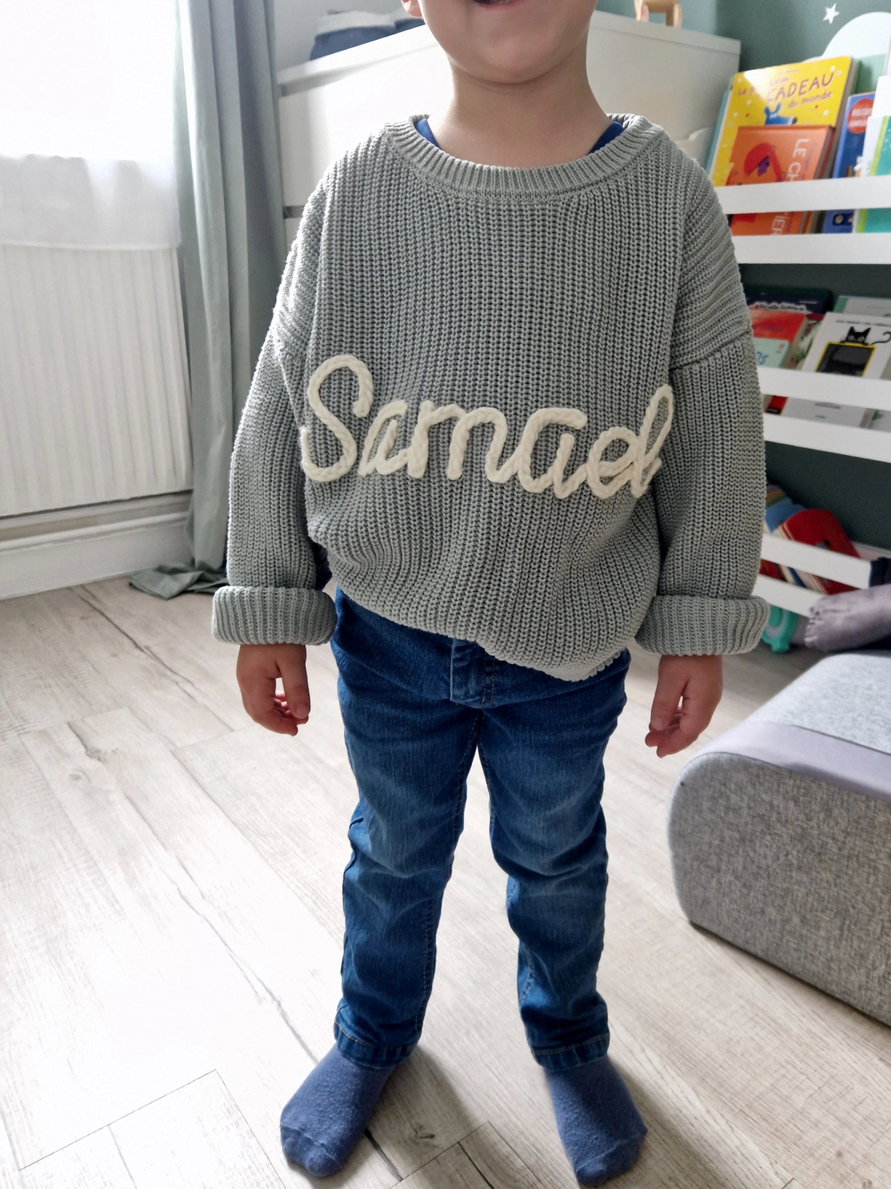 Each personalized baby/child sweater is hand-knitted and embroidered with their name in our workshops.